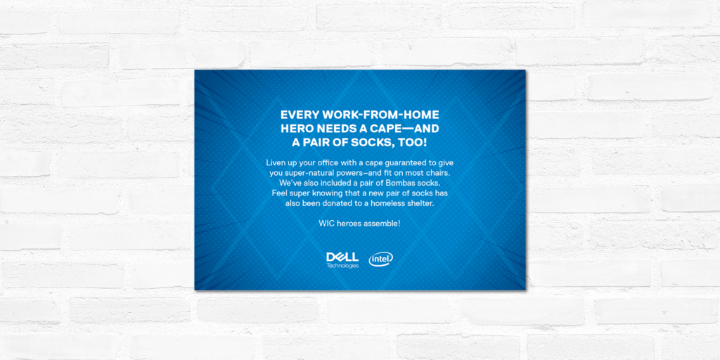 This particular event for Dell Technologies, is a recurring in-person event. In 2020, the event went virtual for the very first time. In an effort to create excitement around what would transition into a virtual event, gifts were sent out to attendees. The theme for this particular event was Work-From-Home Heroes. The gifts that were sent out were a super hero chair cape and a pair of Bombas socks. The chair capes were right on theme for the Work-From-Home Heroes. The Bombas socks were super because every pair that was purchased, another pair was donated to a homeless shelter.