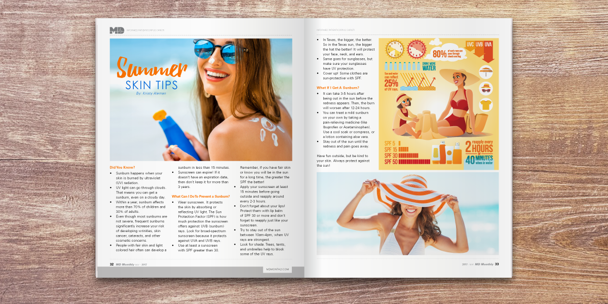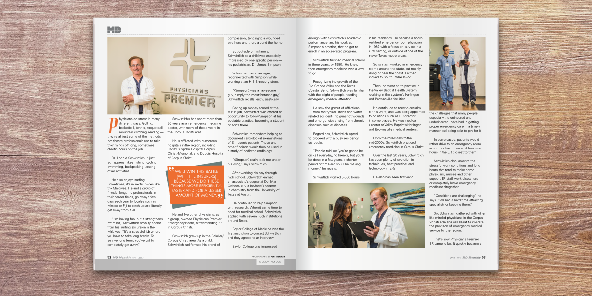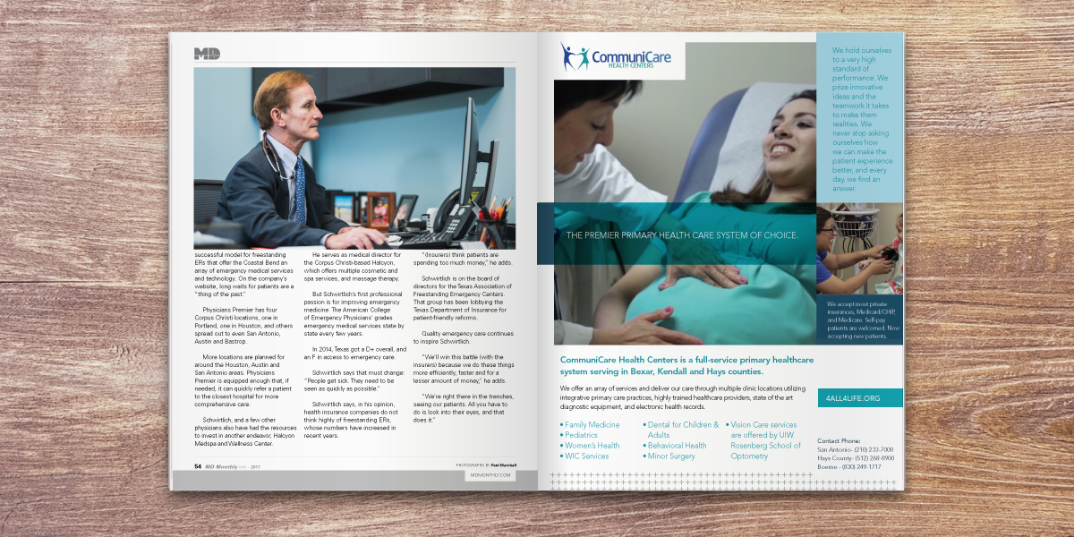 MD Monthly Magazine is a medical publication and a premier resource for physicians and patients state-wide. It features articles and content from each region of Texas providing information on medical topics that span all age demographics and gender. With the exception of a handful of ads, I design the whole magazine from beginning to end, as well as prepare the magazine for print.
