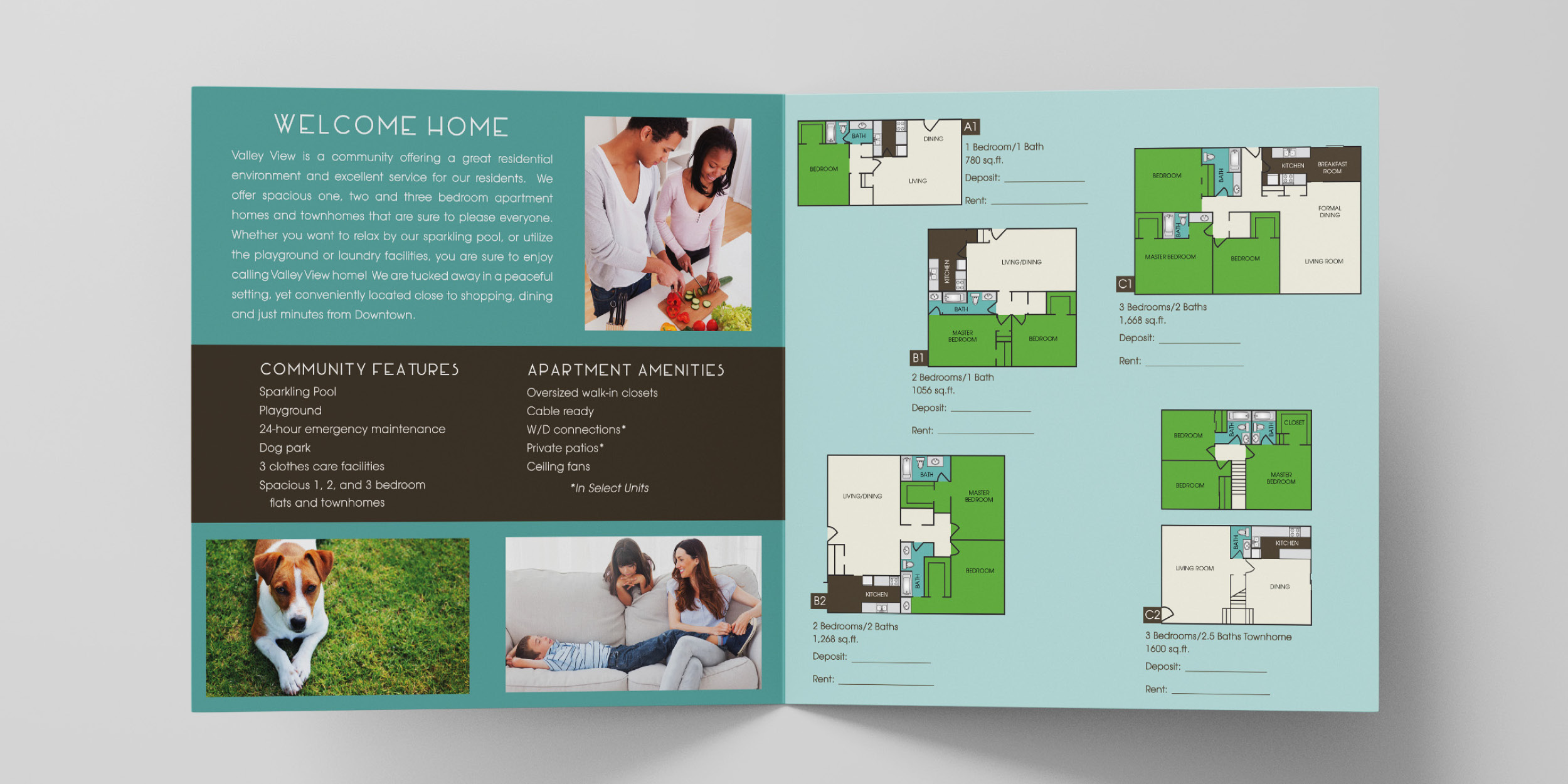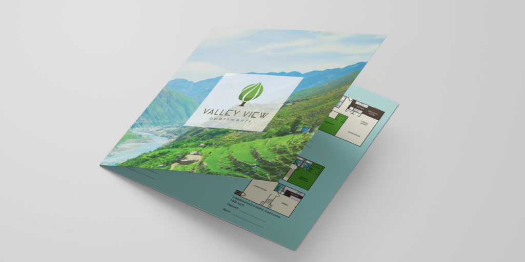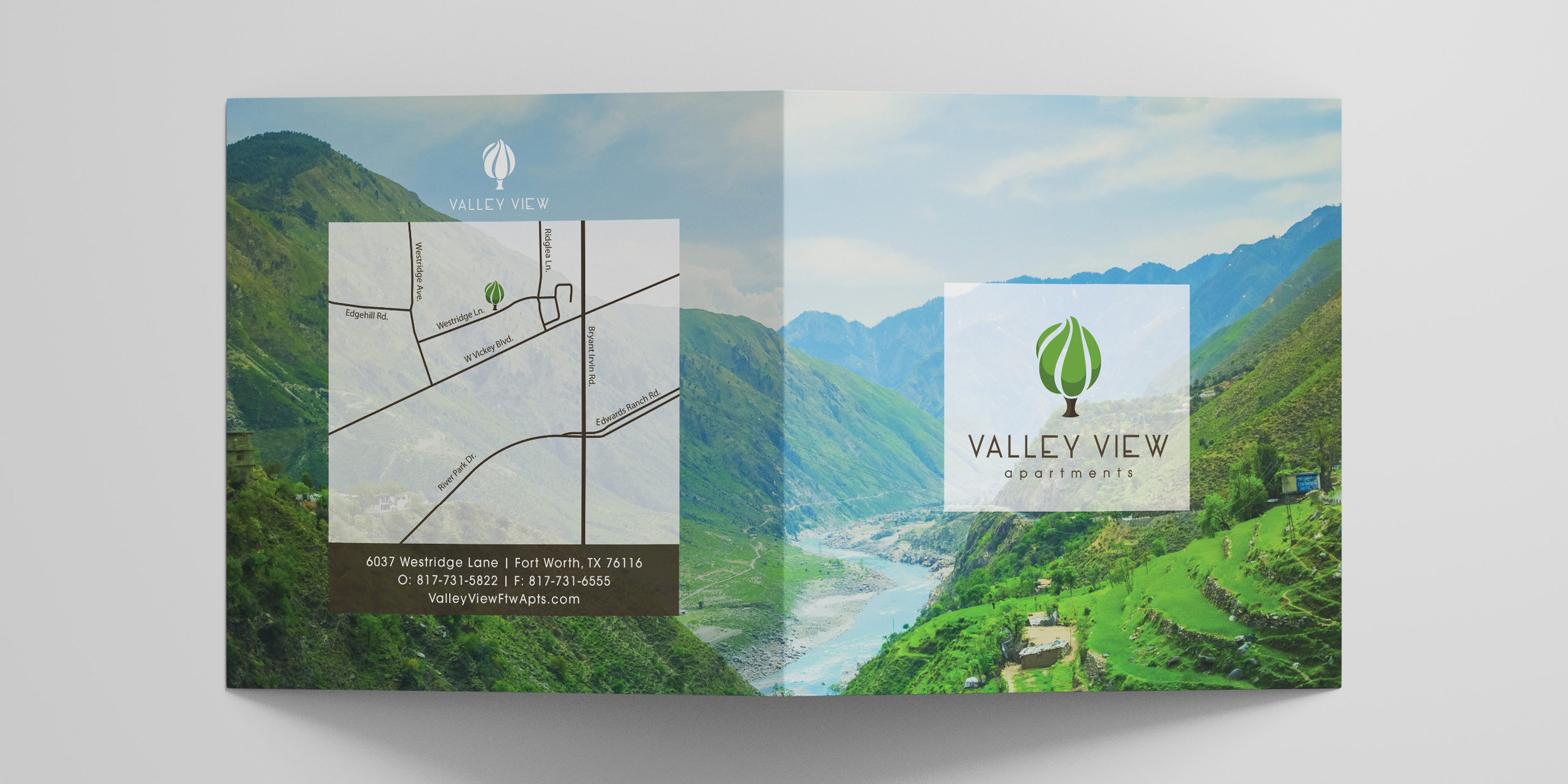 Valley View Fortworth was in need of a new logo, brochures and business cards. I decided to go in a simple and clean direction with the design and use a soft blue complemented with a bold green and beautiful landscape photos to emulate a valley.